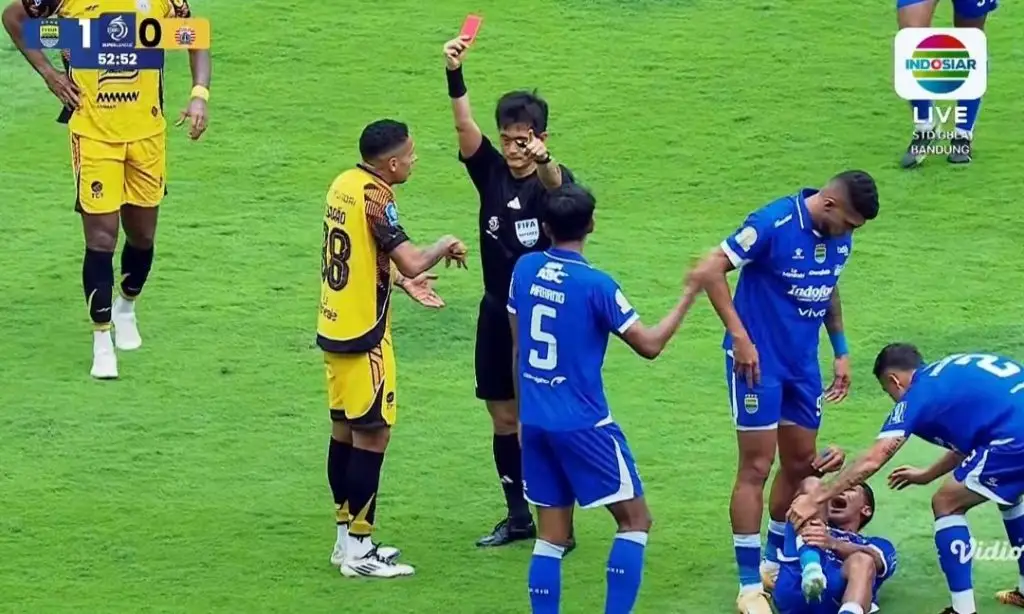 Pemain Persija, Tubarao, harus meninggalkan lapangan setelah menerima kartu merah langsung dari wasit Ko Hyung-jun akibat pelanggaran injakan yang dinilai disengaja.